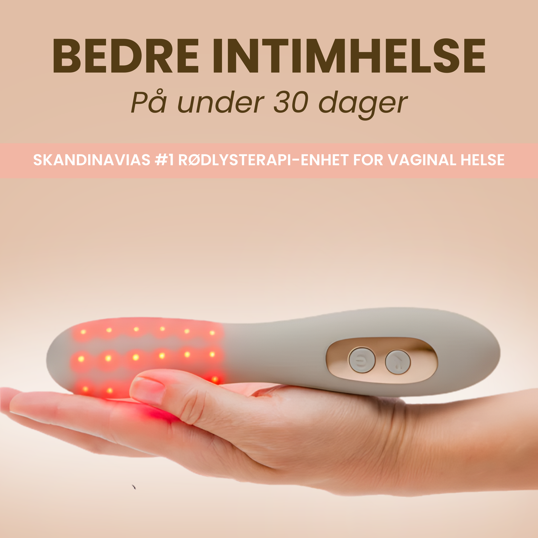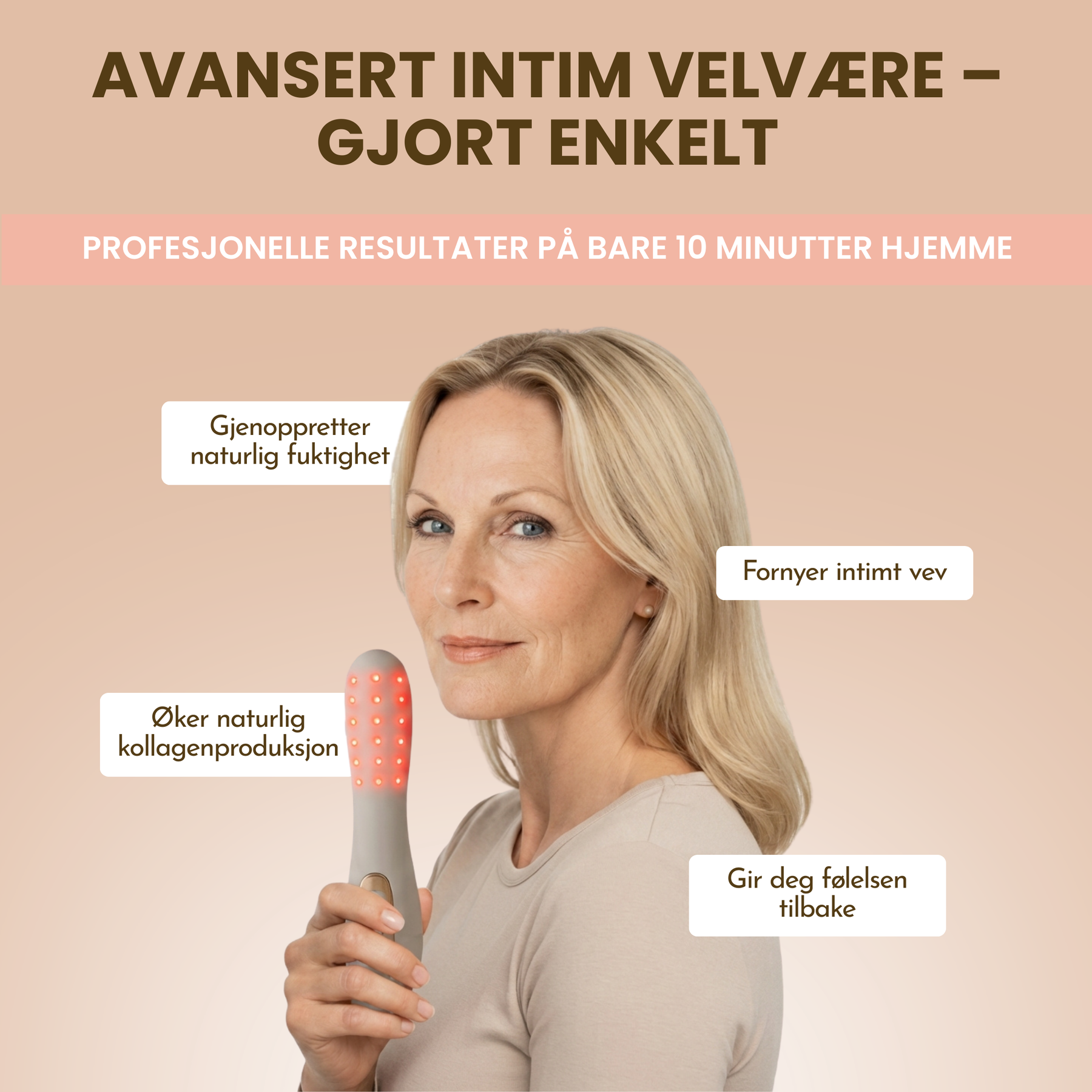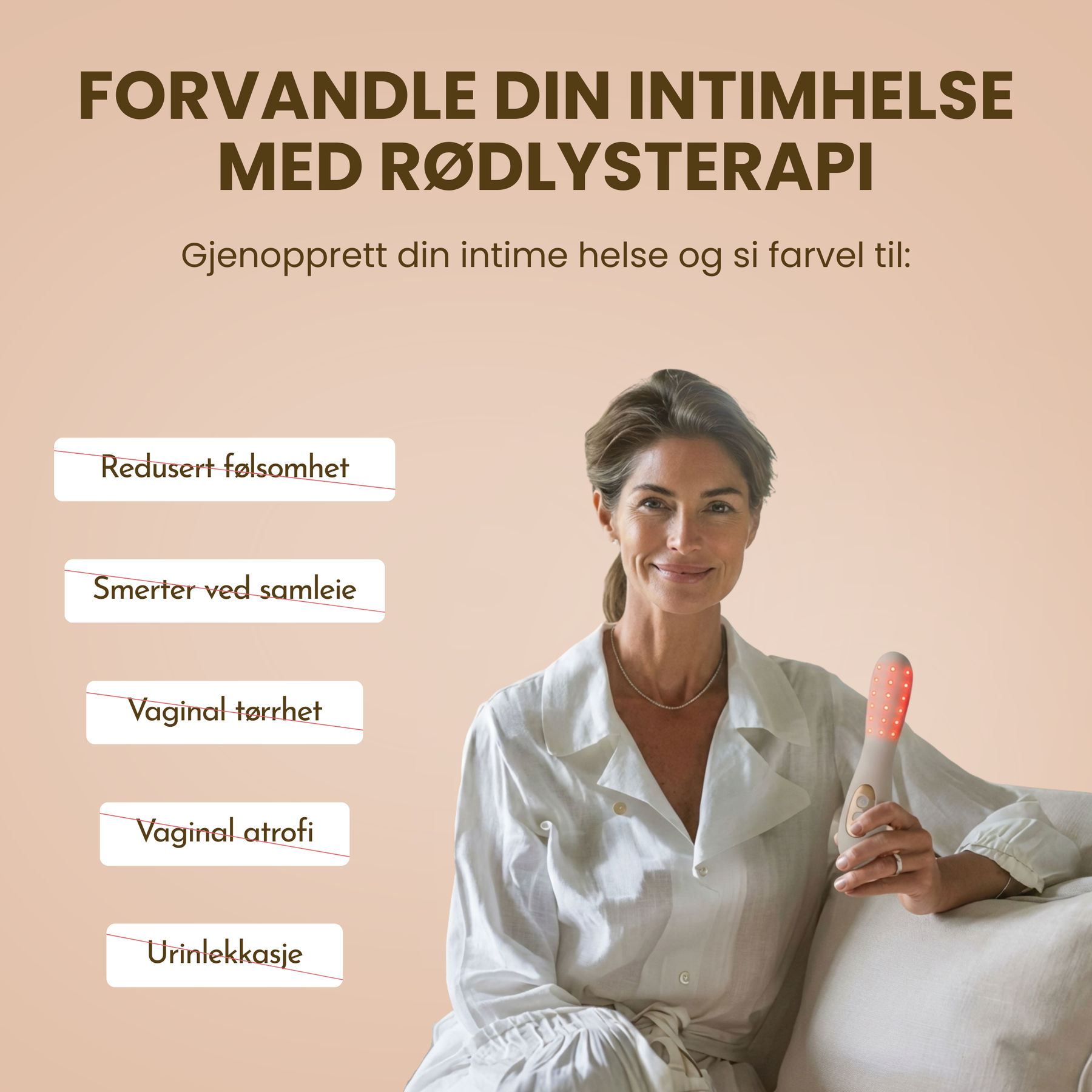Intimstaven – Virker på cellenivå. Rødt lysterapilys stimulerer kroppen til å regenerere vev, produsere kollagen og gjenopprette naturlig fuktighet innenfra.