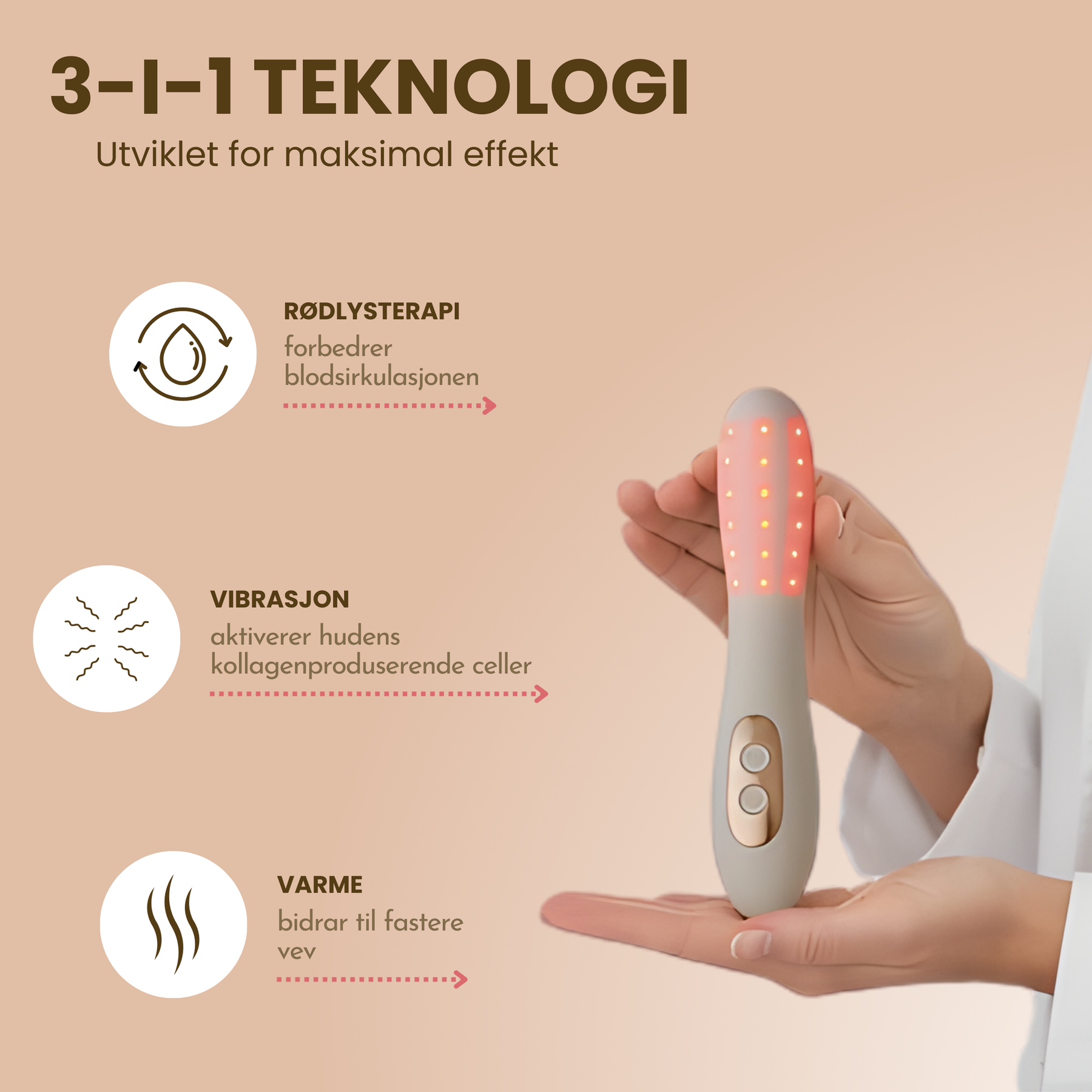 • 3 klinisk dokumenterte teknologier i én enhet: rødt lys (660nm), skånsom terapeutisk varme og sonisk vibrasjon.