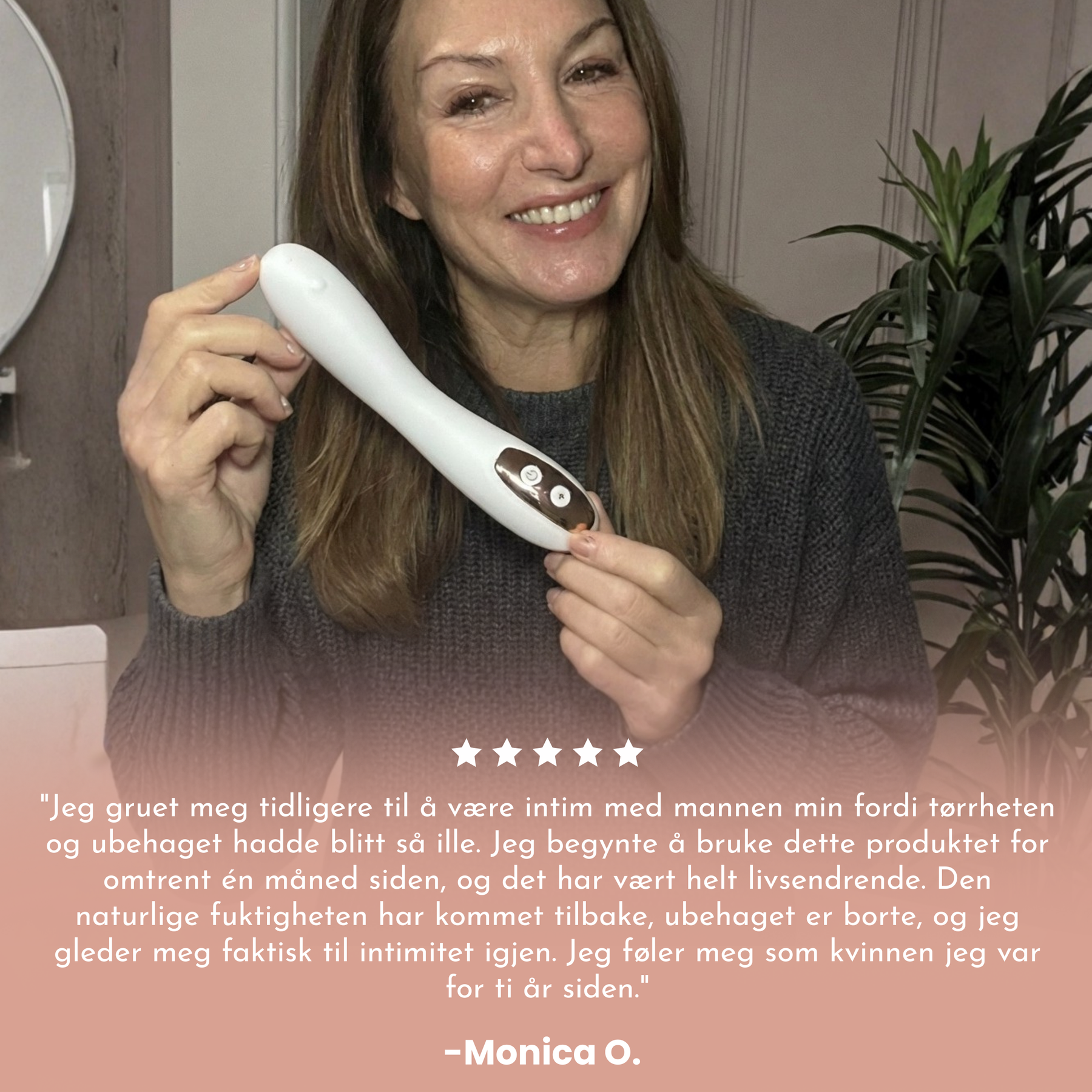 "Så mange kvinner kommer til meg med de samme utfordringene – tørrhet, redusert følsomhet og lekkasjer. Denne enheten er det jeg anbefaler dem å prøve. Den er enkel, skånsom og ikke-invasiv, og den fungerer faktisk. Pasientene mine føler seg bedre og mer selvsikre. Derfor fortsetter jeg å anbefale den."