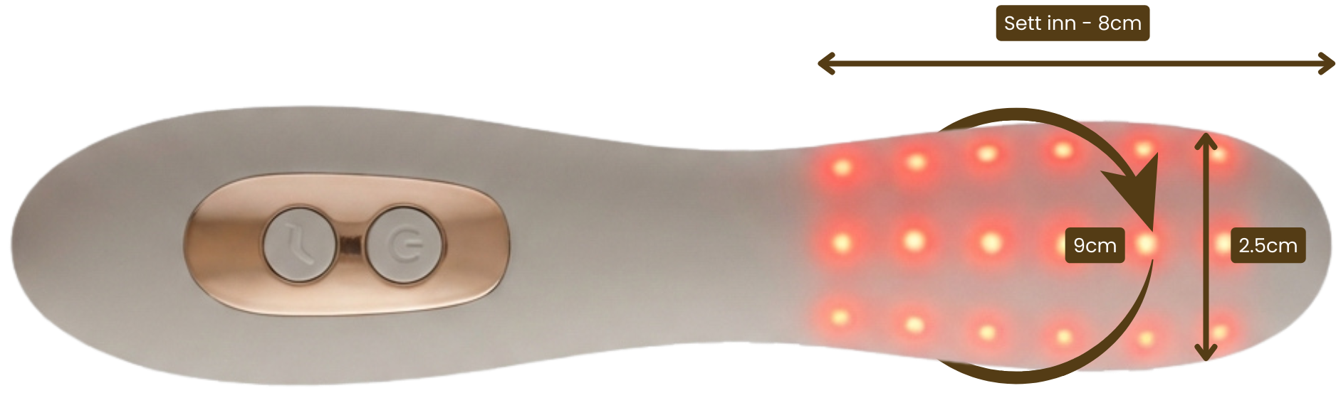 Mindre enn du tror – Intimstaven er slank og ergonomisk, med en behandlingsflate på ca. 8cm i lengde og 2,5cm i bredde, designet for komfortabel bruk.